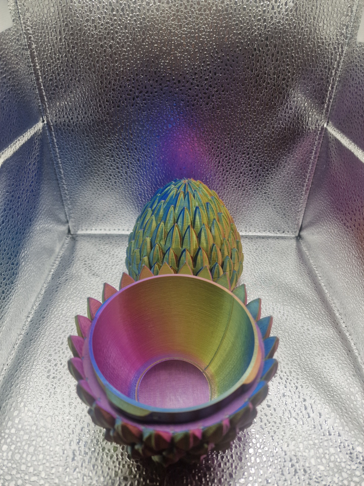 Dette fortryllende drageæg er den perfekte kombination af fantasi og funktionalitet. Med sit smukke, skællignende mønster og intense regnbuefarver fremstår ægget som et magisk artefakt hentet direkte fra en eventyrlig verden.